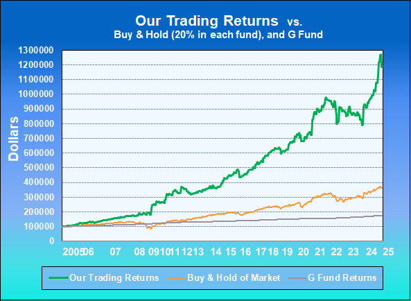 Compounded Returns: Since the inception of our service on January 1, 2005 to the end of 2024, if a member started with $100,000, their initial savings would have increased to $1,189,054 using our real-time trading returns. For the same time period, the buy-and-hold strategy of investing would have only increased to $362,219, while the G Fund increased only to $175,436. These results do not include any personal contributions during those 20 years.