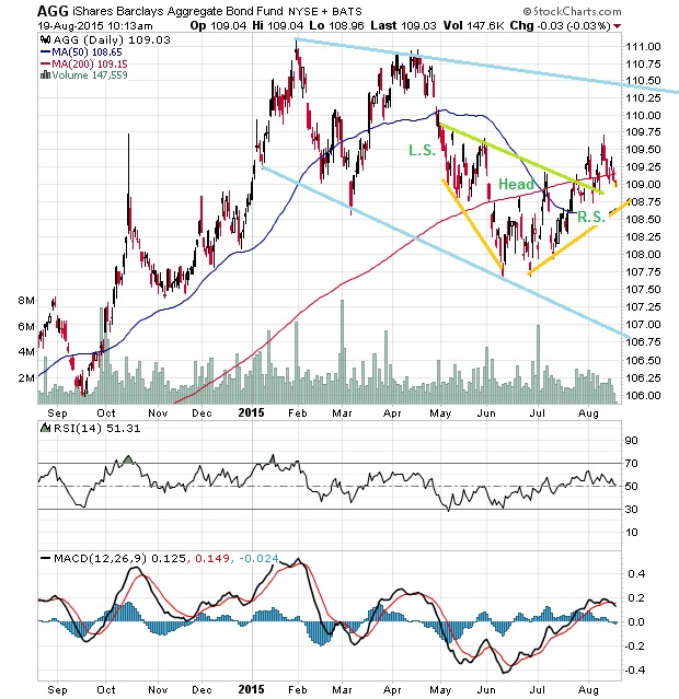 The I Fund is modeled by the EAFE Index iShares (EFA). Lets reiterate the trading activity of EFA, As shown on the chart, EFA reached its previous all-time highs of July '14 in May '15. Once previous highs were reached, this level presented strong resistance. EFA then retraced about 50% (to the price just above 61) of its move from its lows in Jan '15 to highs in May '15. EFA has been trading in a downtrending channel since May '15. The ETF broke out above the upper boundary (blue line, circled in green), and we went long there. Now, we find this to be a false breakout. On Wed (Aug 19), EFA fell through its 200-dma -- this is bearish, and the reason why we can not be in the I Fund.