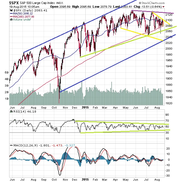 Bullish Conditions: (1) Drawing a line that connects the intraday lows of Dec '14 and Feb '15 gives support around the 2065 level (green line). (2) Drawing another line that connects the lows of May and July '15 (yellow line) somewhat converges with the lower boundary of the intermediate-term uptrend (blue line) around the 2030 level. However, this level would require a further pullback to test this level of support.