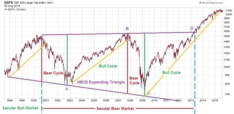 Two major possibilities: 1.) If SPX continues to make new highs (with or without volatility), then we are in a secular bull market. 2.) If SPX starts to decline considerably and back towards or below the upper boundary of the ABCDE expanding triangle, then the market may still be in a secular bear market.