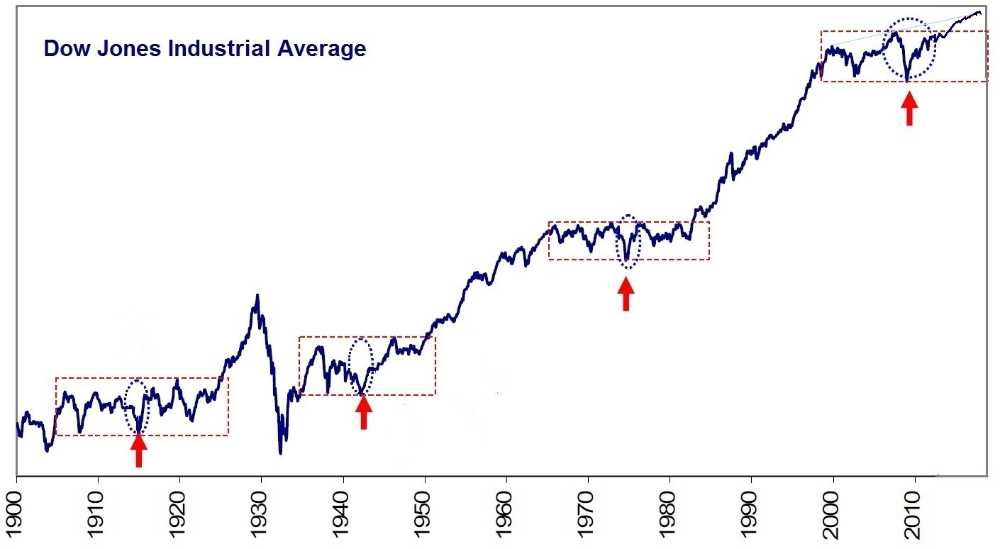 Historical View of the Dow Jones Industrial Average 1900- present (log scale, monthly):