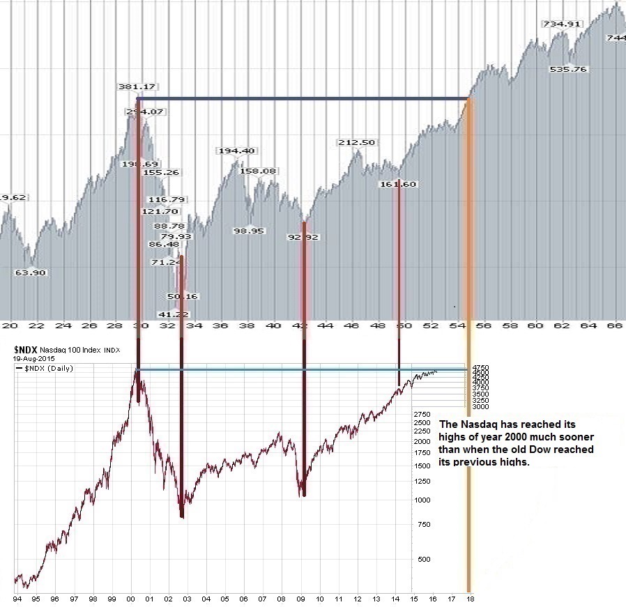 Comparison of the Dow Jones Industrial Average (1920-1966) and Nasdaq (1994-Present):