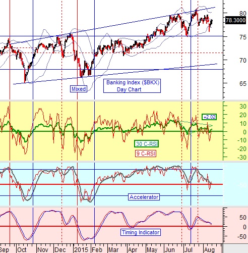 The Banking Index ($BKX) is a key to the market and the economy. Central Bankers are being reported as scared now, so caution is a very good thing to exercise at this point. As shown on the chart below, the Banking Index closed at 78.30 with the C-RSI at a Caution-Positive level of +2.02.