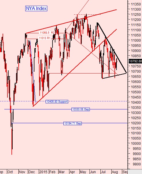 Is the NYA Index stuck? Yesterday, the NYA Index had a down tick inside its triangular pattern. Note that the NYA has not broken above the triangular pattern yet (nor below). There was a prior upside breach, and a downside breach, so there is no clear winning direction. Therefore, there is more work to do in order to move back to the upside. For now, the market is in a very high risk condition, so be careful.