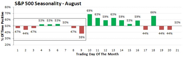 Below is a annual seasonality chart of the S&P 500 Index. This chart shows that the month of August is overall a neutral to bullish month. Then, comes the very bearish months of September and October.