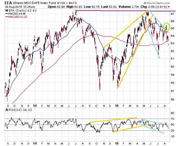 The I Fund is modeled by the EAFE Index iShares (EFA). Lets reiterate the trading activity of EFA, As shown on the chart, EFA reached its previous all-time highs of July '14 in May '15. Once previous highs were reached, this level presented strong resistance. EFA then retraced about 50% (to the price just above 61) of its move from its lows in Jan '15 to highs in May '15. EFA has been trading in a downtrending channel since May '15. The ETF broke out above the upper boundary (blue line, circled in green), and we went long there. Now, we find this to be a false breakout. On Wed (Aug 19), EFA fell through its 200-dma -- this is bearish, and the reason why we can not be in the I Fund.